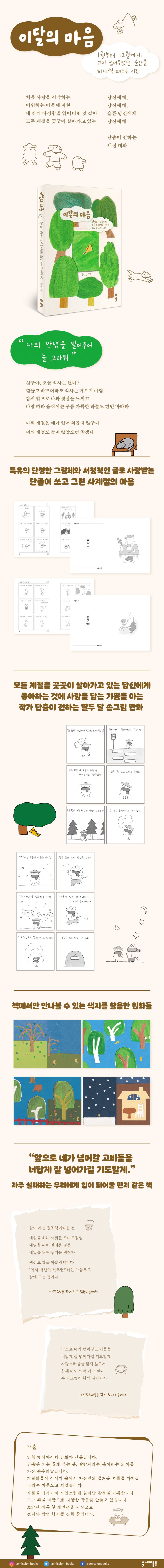 이 책의 또 다른 볼거리는 앞부분에 실린 원화 작품이다. 색지를 오리고 붙여 전체적인 풍경을 묘사하는 종이 아트웍 기법을 활용한 원화로, 종이의 질감과 색감을 통해 계절별 나무의 모습과 하늘의 분위기를 세심하게 표현하였다. 1월부터 12월까지, 달마다 두 가지 이야기를 담은 만화 24개는 봄, 여름, 가을, 겨울 순으로 배치하였다. 열두 달 바뀌는 계절감과 마음의 공통점을 한데 엮은 것이 이 책의 매력 포인트다. 단정한 만화와 생동감 넘치는 봄, 여름, 가을, 겨울 원화를 흠뻑 즐겨보길 바란다.