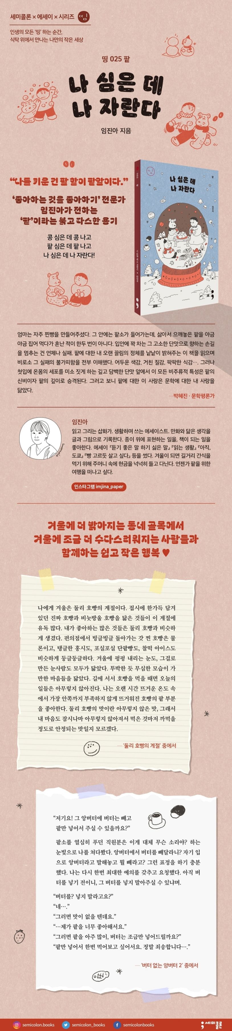 ‘좋아하는 것을 좋아하기’ 전문가로서 『빵 고르듯 살고 싶다』 『읽는 생활』 『아직, 도쿄』 『사물에게 배웁니다』 등 다수의 책을 통해 빵, 커피, 종이로 만든 모든 것 등 좋아하는 것에 대한 글쓰기를 계속해온 임진아 작가가 ‘애호하기’ 능력의 정점을 찍는 책을 출간했다. ‘내가 좋아하는 것을 함께 좋아하고 싶은 마음’이라는 캐치프레이즈 아래 수년간 계속되어온 띵 시리즈의 스물다섯 번째 주제 ‘팥’ 편 『나 심은 데 나 자란다』가 그것이다.