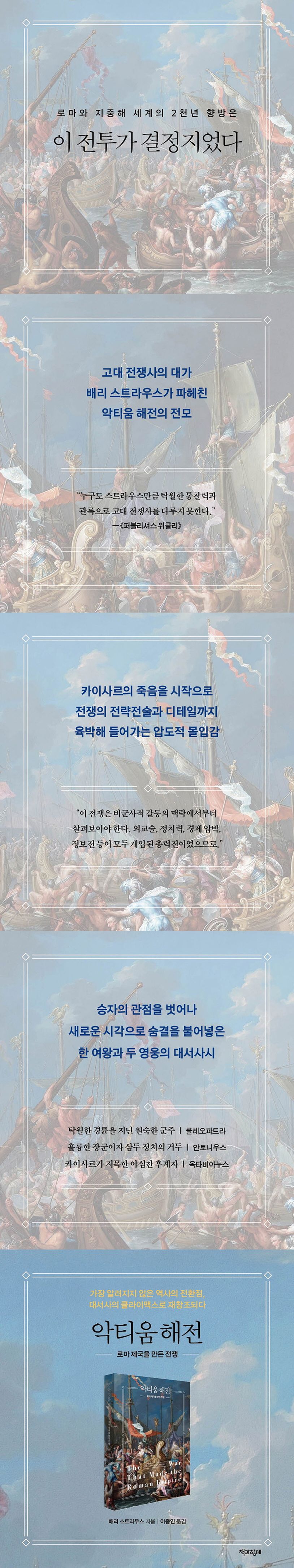 국내 최초로 악티움 해전사를 본격 소개하는 이 책에서 고대 전쟁사의 대가 배리 스트라우스는 여러 문헌 기록과 현대에 발굴된 고고학 자료를 적극 활용해 악티움 해전의 전말을 창조적으로 재구성하고 그 실상을 추적한다. 엎치락뒤치락 긴박한 전황을 생생하게 전달하는 지은이의 유려한 필치를 따라 악티움 해전은 전략 전술은 물론이며 경제, 프로파간다, 외교, 사랑 등 다양한 요소가 얽힌 총력전으로 그려진다. 그 과정에서 옥타비아누스가 고난과 불리함을 극복하고 안토니우스와 클레오파트라에게 마침내 승리한 이유를 면밀히 분석한다. 또한 고대 영웅들의 리더십에 천착해온 지은이답게 전쟁에서 활약한 인물들의 위대함과 인간적 면모를 입체적으로 재조명한다. 승자의 기록에 담긴 편견을 벗겨내며 진실에 다가가는 지은이의 예리한 시선을 따라가다 보면 전쟁사의 색다른 지적 즐거움을 만끽할 수 있을 것이다.
