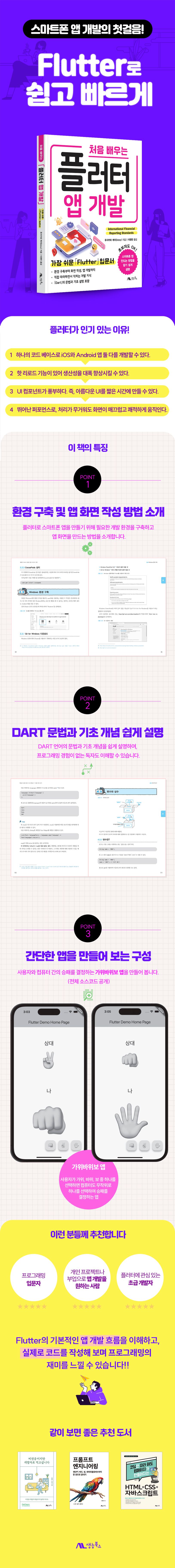 프로그래밍초보자에게쉬운플러터(Flutter)책프로그래밍초보자도Flutter를사용해앱개발을할수있는입문서책입니다.Flutter를배우는의미와프레임워크가있는환경구축(Windows보다Mac쪽이하기쉬움)부터화면작성과앱개발까지직접따라하면서개발지식을터득할수있습니다.Flutter자체는친숙한카운터앱의설명부터시작해화면의색조정,폰트설정,포커스등UI를만들면서배울수있습니다.책의마지막챕터에서는직접앱을만들어보는〈가위바위보〉앱을수록했습니다.이책은개발자분들에게는별로추천하고싶지않습니다.하지만플러터에관심이있거나스마트폰전용앱을개발해보고싶은분들께추천해주고싶습니다.이런분들께추천합니다-프로그래밍미경험자-플로터(Flutter)를처음사용하는엔지니어-개인적으로앱개발을해보고싶은사람역자의글오늘날사람들은스마트폰을사용해서메일을보내고뉴스를보고날씨를확인하고책을읽고게임을한다.스마트폰에서일어나는이런일들은대부분앱을설치하여이용할수있다.애플의앱스토어나구글의플레이스토어에는이러한수많은앱이있다.이앱중에내가만든앱이들어간다면정말기분이좋을것이다.이책은스마트폰에인스톨하여사용하는앱을만드는방법을설명하는책이다.스마트폰앱을만들때사용하는도구는많이있지만이책에서소개하는Flutter를사용하면스마트폰앱을보다빠르고쉽게만들수있다.이책은Flutter로스마트폰앱을만들때가장먼저필요한환경구축과앱화면작성방법,Dart프로그래밍의기본과함께마지막으로실제로앱을하나완성하는구성으로되어있다.책의내용을보고직접따라하도록되어있기때문에초보자라도뭔가를만들고있다는것을체감할수있다.물론본격적인앱을만들려고한다면이책의내용과더불어더많은부분을학습해야하지만이책을통해스마트폰앱을하나간단히완성시켜보면분명다음단계로넘어가고싶은의욕이생길것이다.이책이Flutter로스마트폰앱개발의즐거움을느낄수있는계기가되기를바란다.