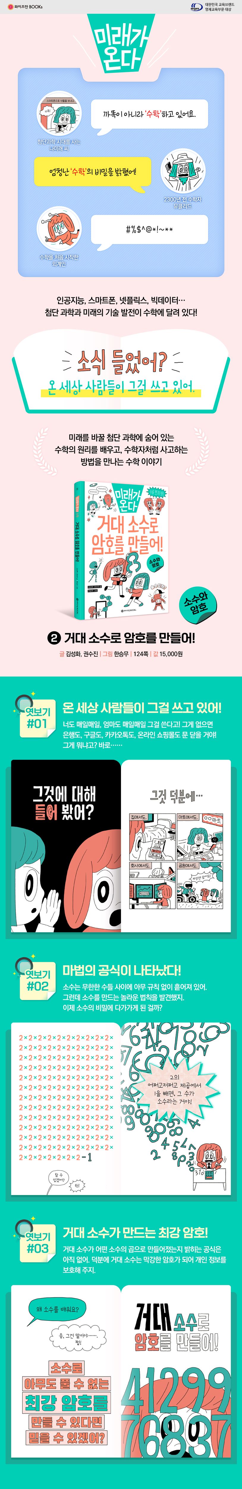 소수를 찾는 방법은 여전히 풀리지 않는 수수께끼로 남아 있다. 다음 소수가 얼마만큼 가야 나타날지도 알 수 없다. 1977년, 수학자들은 이런 미스터리한 소수로, 아무도 풀 수 없는 암호를 만드는 방법을 제시했고, 우리에겐 놀라운 일이 벌어졌다. 소수로 만든 암호가 개인 정보와 신용 카드 정보를 보호해 주면서, 안심하고 온라인 거래를 하게 된 것이다. 소수는 무한하며, 규칙성이 없기 때문에 암호를 생성하기에 안전하고 해독하기가 어렵다. 또 컴퓨터로 쉽고 빠르게 계산할 수 있다. 《거대 소수로 암호를 만들어!》에서는 거대 소수로 암호를 만드는 원리와 함께 미래 수학의 가치를 쉽고 재미있게 알려준다.