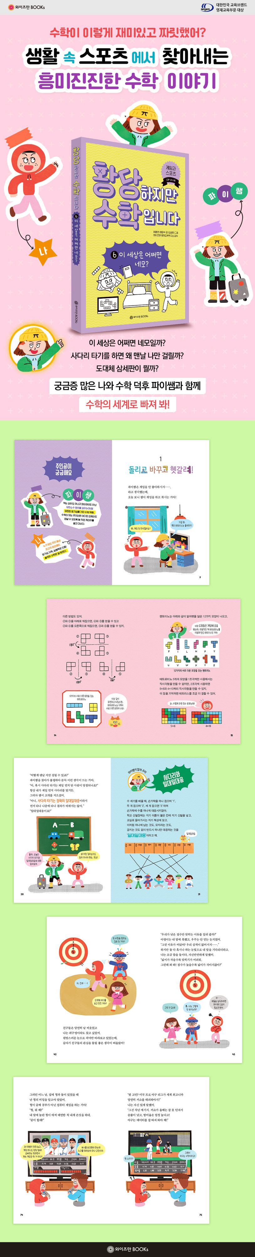 이 책에는 사다리 타기를 하면 왜 맨날 나만 걸릴까? 다트 게임에서 명중이 어려운 이유는 뭘까? 월드컵은 모두 몇 경기나 할까? 야구나 삼세판이 정말 수학과 관계가 있나?와 같은 우리가 한 번쯤 궁금해하거나 호기심을 가져 볼 만한 엉뚱한 질문과 유쾌한 수학으로 가득하다. 이런 아주 사소하고도 친근한 그야말로 생활밀착형 궁금증을 어린이들이 좋아하는 게임, 스포츠와 함께 알아보다 보면 수학과 친해지고 세상을 수학적으로 이해하게 될 것이다.