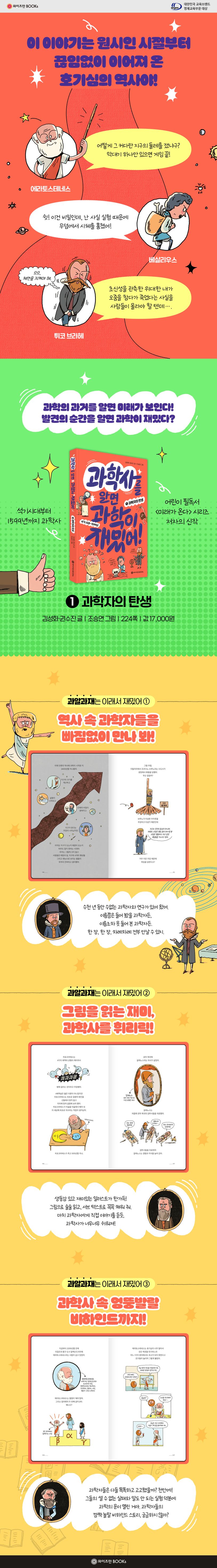 〈과학사를 알면 과학이 재밌어! 1. 과학자의 탄생〉은 시리즈의 첫 권으로 ‘과학자의 탄생’에 대한 이야기다. 인류의 호기심에서 출발해 고대, 중세를 거쳐 르네상스의 과학 혁명 직전까지의 이야기를 담았다. 최초의 과학자 탈레스, 지구 둘레를 잰 에라토스테네스, 하늘을 향한 갈릴레오의 망원경까지, 위대한 발견의 순간들이 그림과 함께 이야기로 펼쳐진다.