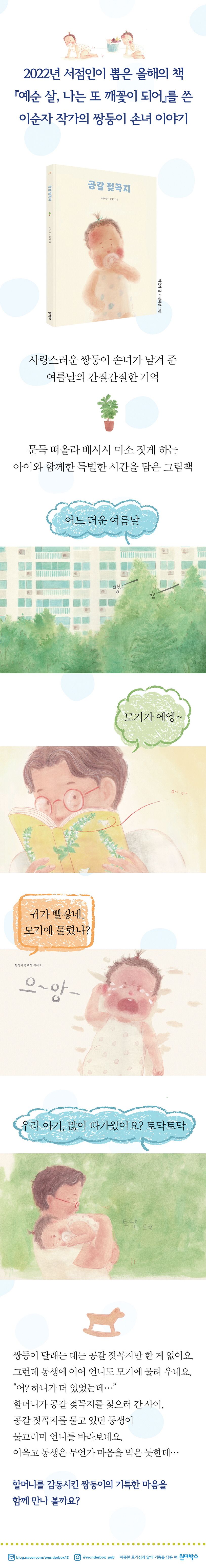 2022년 서점인이 뽑은 올해의 책 『예순 살, 나는 또 깨꽃이 되어』를 쓴 이순자 작가의 쌍둥이 손녀 이야기. 배시시 미소 짓게 만드는 사랑스러운 글과 동물을 사랑하는 작가 김혜정의 따뜻한 그림이 만나, 서로를 아끼는 두 아이의 다정한 마음이 오롯하게 담긴 포근한 그림책 『공갈 젖꼭지』가 태어났다.