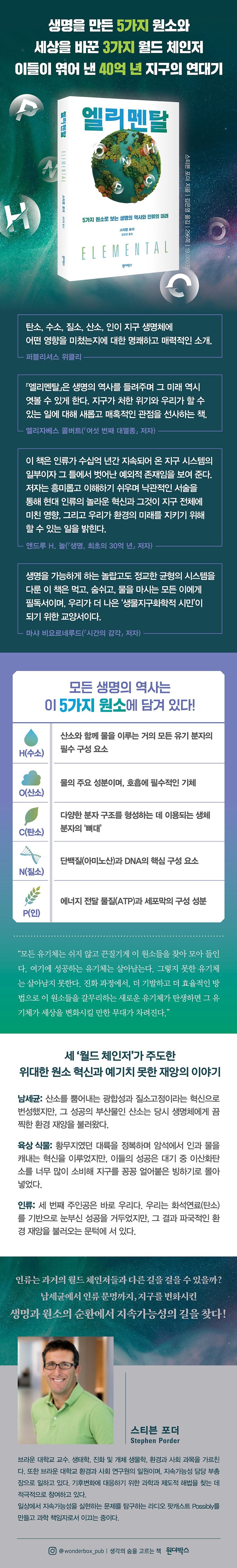 이 책 『엘리멘탈』은 지구를 가장 크게 변화시킨 건 바로 ‘생명’이었으며, 그 변화의 근간에는 5가지 원소가 있다고 말한다. 브라운대학교의 생태학자 스티븐 포더는 수소(H), 산소(O), 탄소(C), 질소(N), 인(P)을 중심으로 40억 년 생명의 역사를 추적한다. ‘생명의 공식: HOCNP’를 이루는 이 원소들을 얻기 위한 생명체의 노력은 진화의 원동력이 되었으며, 나아가 지구 자체를 송두리째 바꿔놓았다. 남세균, 육상 식물 그리고 우리 인간은 그 일에 가장 성공하며 ‘월드 체인저’가 되었다.