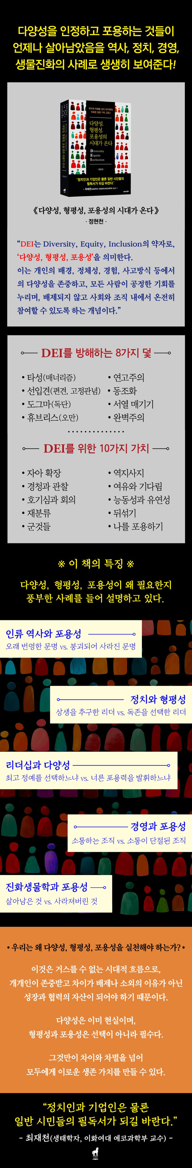 이를 위해 저자는, 인류 역사, 정치, 경영, 진화생물학, 심리학 등을 다룬 수많은 책에서 다양한 이론과 사례를 발췌하고 DEI와 연관지어 설명함으로써 독창적인 통찰력을 보여준다. 뿐만 아니라 ‘DEI를 방해하는 8가지 덫’에서 연고주의, 서열 매기기, 매너리즘, 편견, 도그마 등, 우리가 극복해야 할 것들이 구체적으로 무엇인지 지적하고, ‘DEI를 위한 10가지 가치’에서는 차이가 우리 사회와 조직에 자산이 되는 구체적 가치를 제시한다. 즉 역지사지, 경청과 관찰, 능동성과 유연성, 자아 확장, 뒤섞기, 호기심과 회의(懷疑) 등을 실천할 수 있는 시스템과 문화, 구조를 만듦으로써 우리 조직이, 우리 기업이, 우리 사회가 사라지지 않고 번영하는 길을 가자고 말한다.