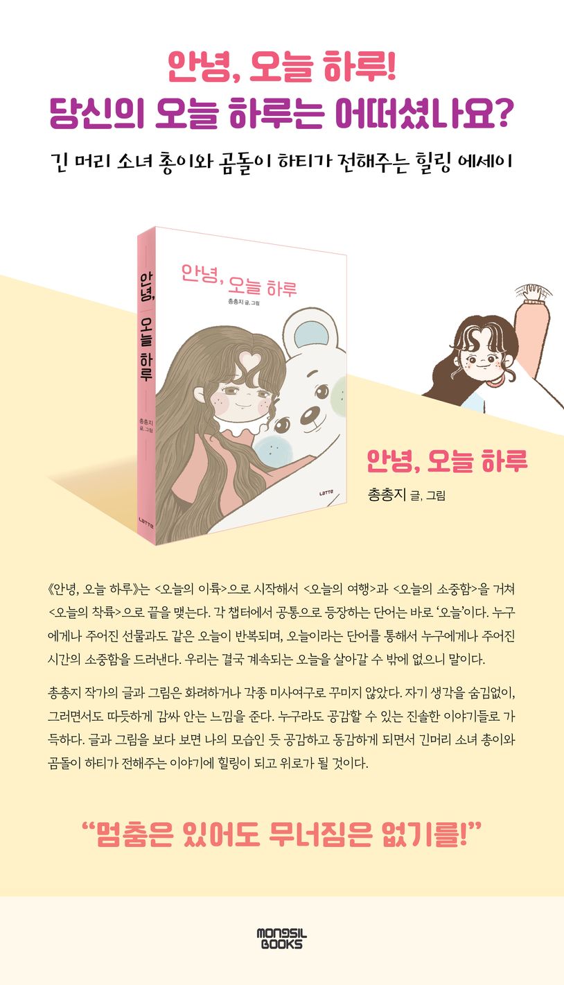 작가는 모든 사람에게 조금의 위로와 약간의 휴식을 줄 수 있는 글과 그림이 있는 책을 만들고 싶다는 생각으로 10년 만에 완성한 글과 그림이 잘 어우러진 힐링 에세이다. 누구나 한 번쯤은 겪어봄 직한 이야기들로 구성된 글과 그림에 공감하고 동감하게 되면서 긴 머리 소녀 총이와 곰돌이 하티가 전해주는 이야기에 힐링이 되고 위로가 될 것이다.
