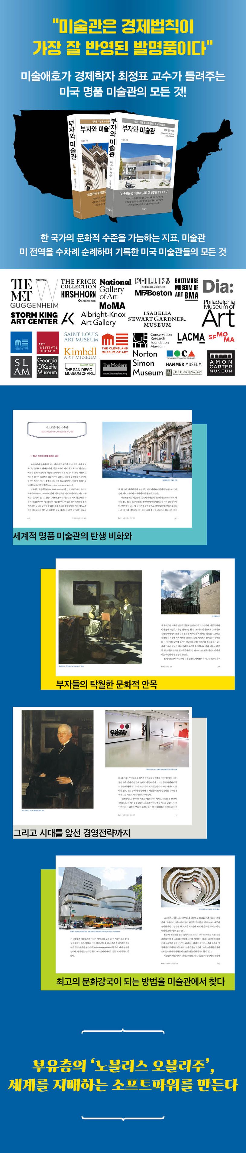 “미술관은 경제법칙이 가장 잘 반영된 발명품이다”. 『부자와 미술관』의 저자인 미술애호가 최정표 교수는 경제학자답게 미학적 측면보다는 경제·문화적 관점에 중점을 두고 미국의 30여 명품 미술관들을 순례하고 분석했다. 미국은 이민으로 시작된 후발 국가로, 19세기까지만 해도 서구세계의 문화적 변두리에 지나지 않았다. 루브르 미술관도 대영박물관도 그들에게는 그저 선망의 대상일 뿐이었으며, 유럽에 대해 심한 문화적 열등감에 시달려야 했던 것은 당연한 일이었다. 하지만 미국 부자들의 아낌없는 기부와 투자로 그 반전은 시작되었다. 메트로폴리탄 미술관, 보스턴 미술관, 시카고 미술관 등 세계 최고의 미술관이 세워졌고, 마침내 수십 년 만에 세계의 문화적 중심지는 파리에서 뉴욕으로 옮겨오게 됐다.