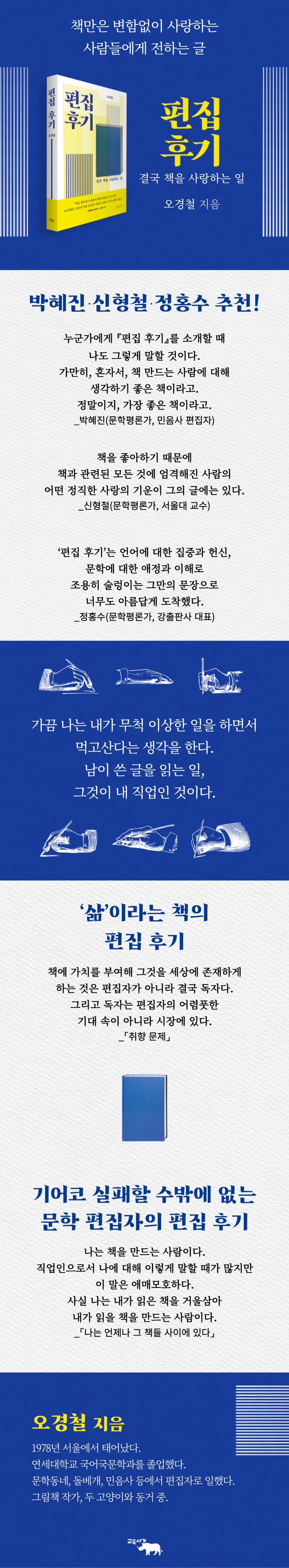책을 좋아하는 사람의 앞에는 두 갈래 길이 놓여 있다. 행복한 독자로 사는 길과 책을 업으로 삼는 길이다. 책에 푹 빠진 채 주변을 둘러볼 겨를도 없이 걷다보면 어느새 책이 업이 돼 있다. 이때부터는 재밌는 책을 읽어도 이전만큼 순수하게 즐길 수 없다. 당연한 수순인 듯 책을 만들게 된 저자는 애서가와 편집자의 삶에서 오는 괴리에 방황하며 고뇌한다. 저자는 편집자의 일을 한 문장으로 명쾌하게 설명하지는 못하지만, 이 책 한 권에 걸쳐 편집자라는 ‘이상한 일’을 설명해낸다. 책을 향한 지독한 사랑을 표출할 방법이 책을 만들고 책에 관해 쓰는 일뿐이었던 한 사람이 “책만은 변함없이 사랑하는 사람들”에게 전하는 글이다.