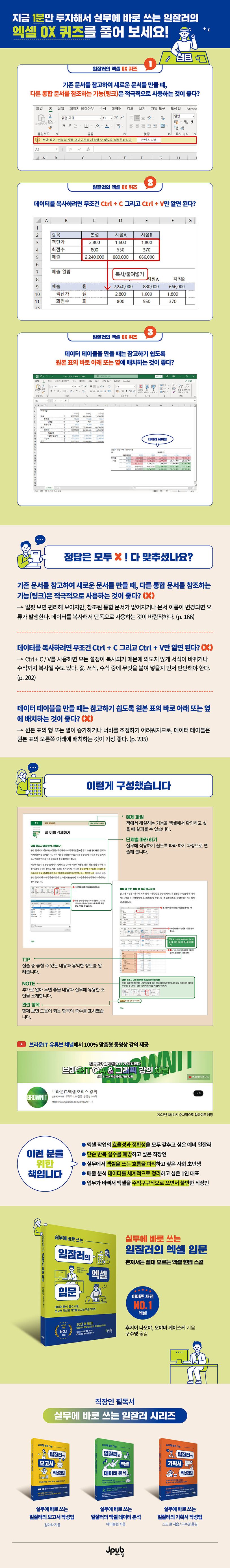 이 책은 엑셀 입문자들이 실무에서 흔히 겪는 크고 작은 실수에서 착안한 노하우를 정리한 생생한 가이드다. 먼저, 이해하기 쉽게 표를 만드는 방법과 실수가 걱정되는 반복 업무를 신속 정확하게 수행하는 방법을 소개한다. 더 나아가, 엑셀의 핵심인 실무 데이터를 목표에 맞게 분석하고 차트를 효과적으로 시각화하는 기술까지 담았다. 끝으로 알아 두면 유용한 인쇄용 PDF를 만드는 방법과 매크로 수행의 기초도 살펴본다. 선배들의 오답 노트를 통해 실무자의 감이 없으면 놓치기 쉬운 일잘러의 센스를 배워보자.