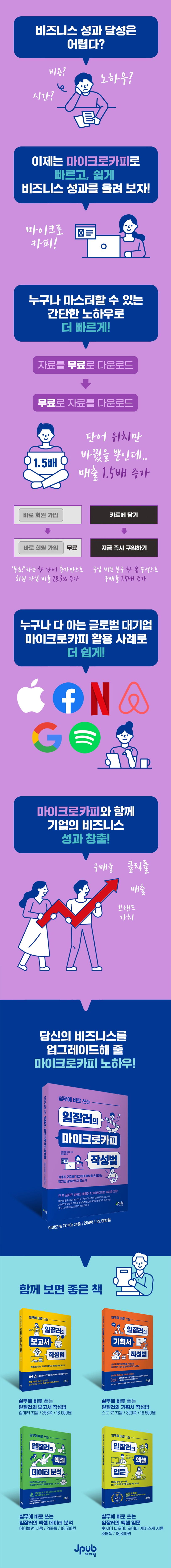 디지털 시대, 사용자와의 소통이 성공적인 비즈니스의 핵심으로 떠오르면서 글로벌 대기업을 중심으로 마이크로카피가 주목받고 있다. 마이크로카피는 버튼의 문구, 에러 메시지 등에 사용되는 짧고 간결한 문구이지만, 사용자 경험(UX)을 크게 개선해 비즈니스 성과를 향상시킬 수 있는 강력한 도구이다. 이 책은 마이크로카피 작성법의 핵심 원칙을 자세히 설명하고, 2,000개 이상의 기업에서 검증한 마이크로카피 활용 사례를 통해 마이크로카피를 실무에 적용하는 방법을 안내한다. 빠르게 매출을 올리고자 하는 사업자, 웹/앱 페이지를 운영하는 담당자, 마케터, UX 라이터 등 누구나 활용할 수 있는 짧지만 강력한 마이크로카피와 함께 기업 비즈니스 성과를 끌어올려 보자.