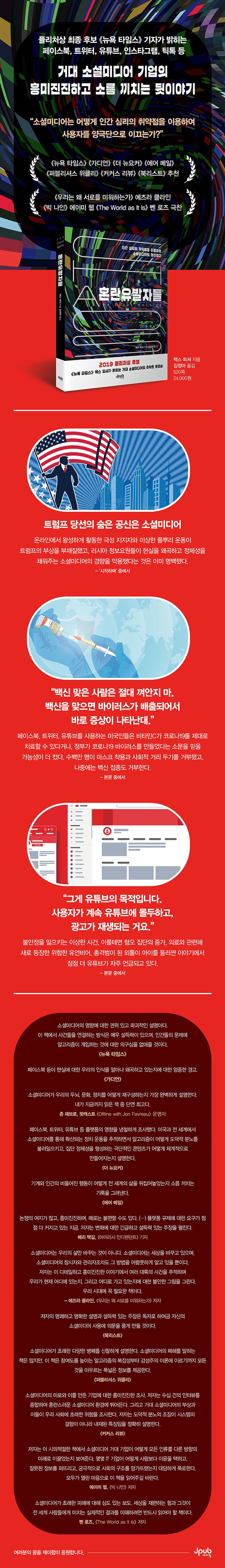 우리는 편향된 소셜미디어가 우리의 정신, 자녀, 민주주의에 해롭다는 사실을 막연하게 알고 있다. 하지만 그 범위와 영향력은 짐작하는 것보다 훨씬 넓고 깊다. 저자는 수년간의 취재를 바탕으로 페이스북, 트위터, 유튜브, 인스타그램, 틱톡 등의 소셜미디어가 어떻게 인간 심리의 취약점을 이용하여 사용자를 양극단으로 이끄는지 파헤치고, 흥미진진하고 소름 끼치는 소셜미디어의 뒷이야기를 들려준다. 빅테크의 문 뒤에서 어떤 일이 벌어지고 있는지 경종을 울리고 너무 늦기 전에 세상에 닥친 혼란을 막아야 한다는 외침을 던지는 책이다.