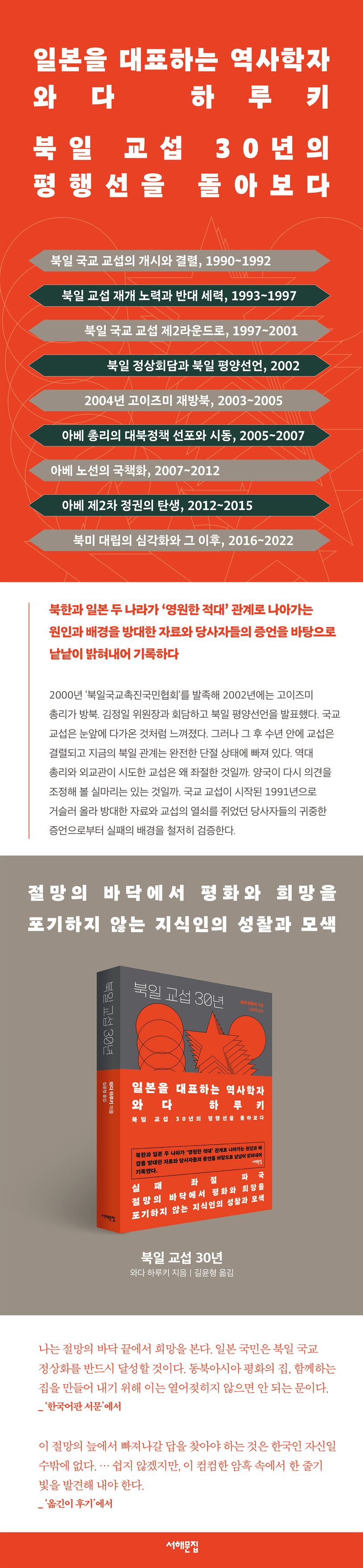 그럼에도 일본과 북한 사이에는 다양한 관계가 형성되었다. 1959년 재일 조선인 귀국이 대표적이다. 이 사업은 1962년까지 계속돼 총 9만 명의 재일 조선인이 북한으로 이주하게 됐다. 하지만 1965년 한일 기본조약으로 일본과 한국의 국교가 열리면서, 북일 관계는 다시 긴장 관계에 놓인다. 그러던 1972년 7·4 남북공동성명 발표 이후에는 북일 사이에 무역이 시작되기도 했다. 한편, 공식적인 국교 수립 노력은 1991년이 되어서야 시작되기에 이른다. 그러나 1991년부터 1992년까지 8차례 이어진 회담은 결국 결렬되고 만다. 그리고 그 상태는 2000년 9차 회담이 재개될 때까지 이어졌고, 이때와 맞물려 일본 시민사회에서는 “2001년 중에 늦어도 2002년 월드컵 개최까지는 북일 교섭을 실현하자”라는 목표 아래 ‘북일국교촉진국민협회’가 설립돼 북일 국교 정상화를 위해 활동하기 시작한다. 이 책은 이 협회에서 사무국장을 맡았던 역사학자 와다 하루키가 협회의 활동을 비롯한 북일 국교 수립의 역사를 반성적으로 되짚어 본 백서라 할 수 있다.