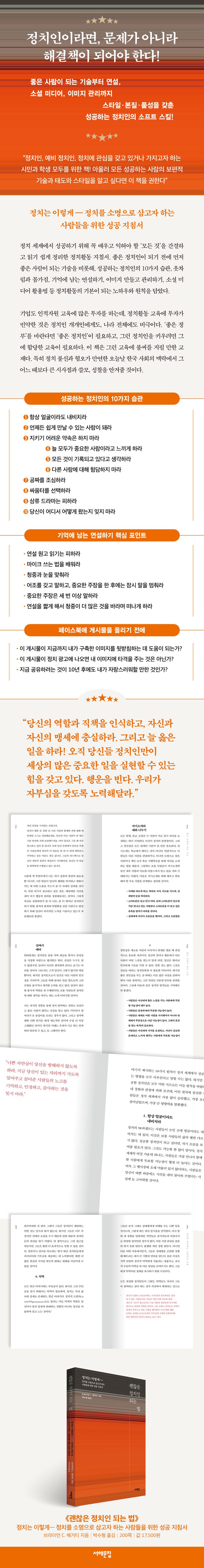 미국의 선출직 정치인이 다년간의 현장 경험을 토대로, 정치 세계에서 성공하기 위해 꼭 배우고 익혀야 할 ‘모든 것’을 간결하고 읽기 쉽게 정리한 정치활동 지침서. 그 ‘모든 것’에는 좋은 정치인이 되기 전에 먼저 좋은 사람이 되는 기술뿐만 아니라, 정치활동의 기본이 되는 노하우와 원칙, 즉 성공하는 정치인의 10가지 습관, 옷차림과 몸가짐, 기억에 남는 연설하기, 이미지 만들고 관리하기, 소셜 미디어 활용법 등이 포함된다. 또한 성공한 정치가로 널리 알려진 인물들이 몰래 간직하고 활용했던 많은 비법도 담고 있다.