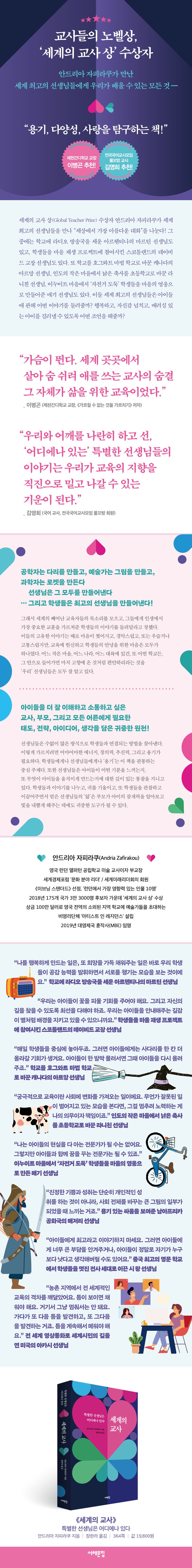 이 책에서 저자는 세계 곳곳의 경이로운 선생님 서른 명과 이야기를 나눈다. 그중에는 학교에 라디오 방송국을 세운 아르헨티나의 마르틴 선생님도 있고, 학생들을 마을 재생 프로젝트에 참여시킨 스코틀랜드의 데이비드 교장 선생님도 있다. 또 학교를 호그와트 마법 학교로 바꾼 캐나다의 아르망 선생님, 인도의 작은 마을에서 낡은 축사를 초등학교로 바꾼 라니친 선생님, 이누이트 마을에서 ‘자전거 도둑’ 학생들을 마을의 영웅으로 만들어준 매기 선생님, 중국 최고의 명문 학교에서 학생들을 가르쳤던 시 왕 선생님도 있다. 이들 세계 최고의 선생님들은 아이들에 관해 어떤 이야기를 들려줄까? 행복하고, 자신감 넘치고, 배려심 있는 아이를 길러낼 수 있도록 어떤 조언을 해줄까?
