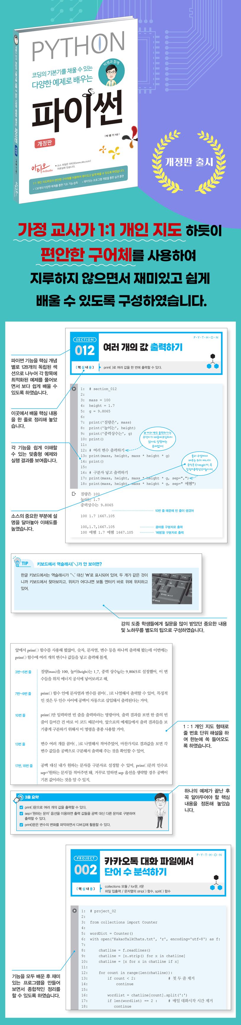 현재 시점에 맞게 수정한 최신 개정판으로, 파이썬을 처음 접하는 사람이 기초를 쉽게 익히고 실무에 응용할 수 있도록 핵심 개념별로 136개의 독립된 항목으로 나누어 각 항목에 최적화된 예제를 풀어보면서 배울 수 있도록 하였습니다. 특히, 필자의 현장 교육 경험을 바탕삼아 1:1 개인 지도하듯이 편안한 구어체를 이용하여 지루하지 않게 파이썬을 공부할 수 있도록 배려하였습니다.