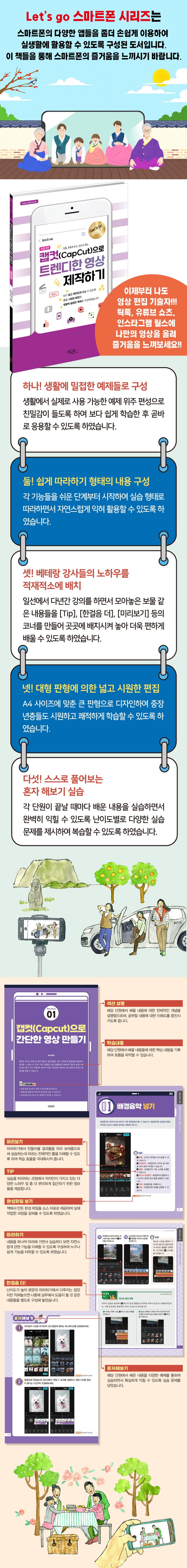 전세계 5억명 이상이 다운로드받은 가장 인기있는 동영상 앱인 캡컷을 이용하여 스마트폰으로 찍은 영상들을 입맛대로 편집하는 방법을 설명합니다. 특히 틱톡, 유튜브 쇼츠, 인스타그램 릴스 등 짧은 영상들이 대세로 떠오르면서, 보다 쉽게 편집할 수 있도록 하는 다양한 기법들을 다루었습니다.
