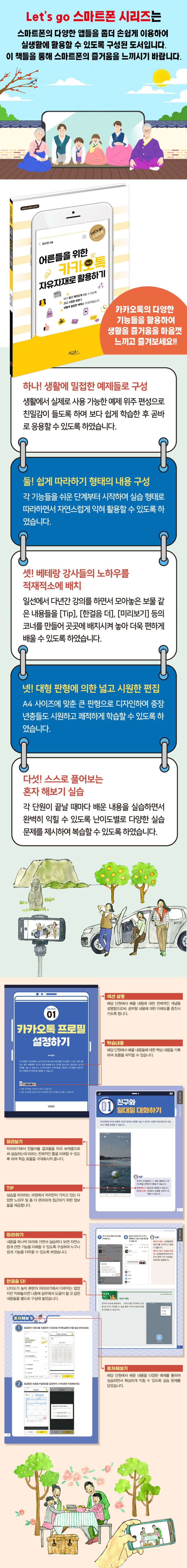 국내 대다수 사용자가 사용하고 있는 카카오톡의 다양한 기능들을 스마트폰 사용에 익숙치 않은 어르신들이 쉽게 사용하여 생활의 즐거움을 보다 충실히 느낄 수 있도록 구성한 책입니다.