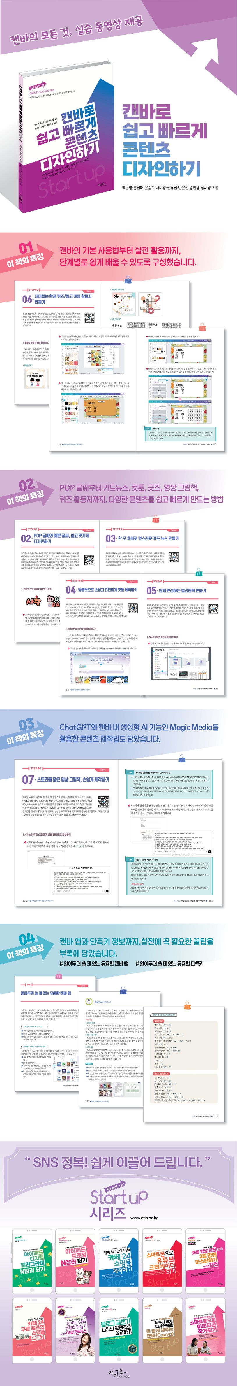 『캔바로 쉽고 빠르게 콘텐츠 디자인하기』는 기초부터 실전까지 캔바 기능을 단계별로 안내합니다. POP 글씨, 카드뉴스, 컷툰, 굿즈, 영상 그림책, 퀴즈 활동지 등 다양한 콘텐츠를 손쉽게 만드는 방법을 소개합니다. 특히, 최근 주목받는 생성형 AI를 활용해 ChatGPT와 캔바의 Magic Media를 함께 다루는 것이 특징입니다.
