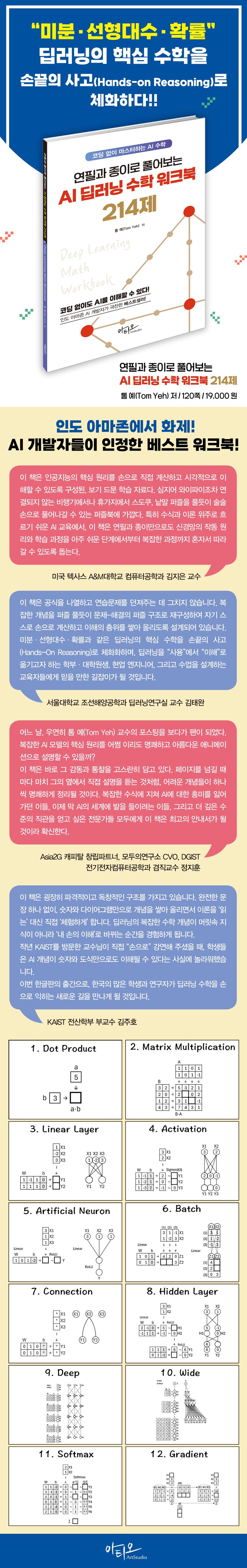 전세계 AI 전문가들이 극찬한 핸즈온 워크북으로 복잡한 코드와 프로그래밍 없이, 오직 손을로 직접 계산하며 딥러닝의 수학적 원리를 체득할 수 있는 혁신적인 학습서입니다.