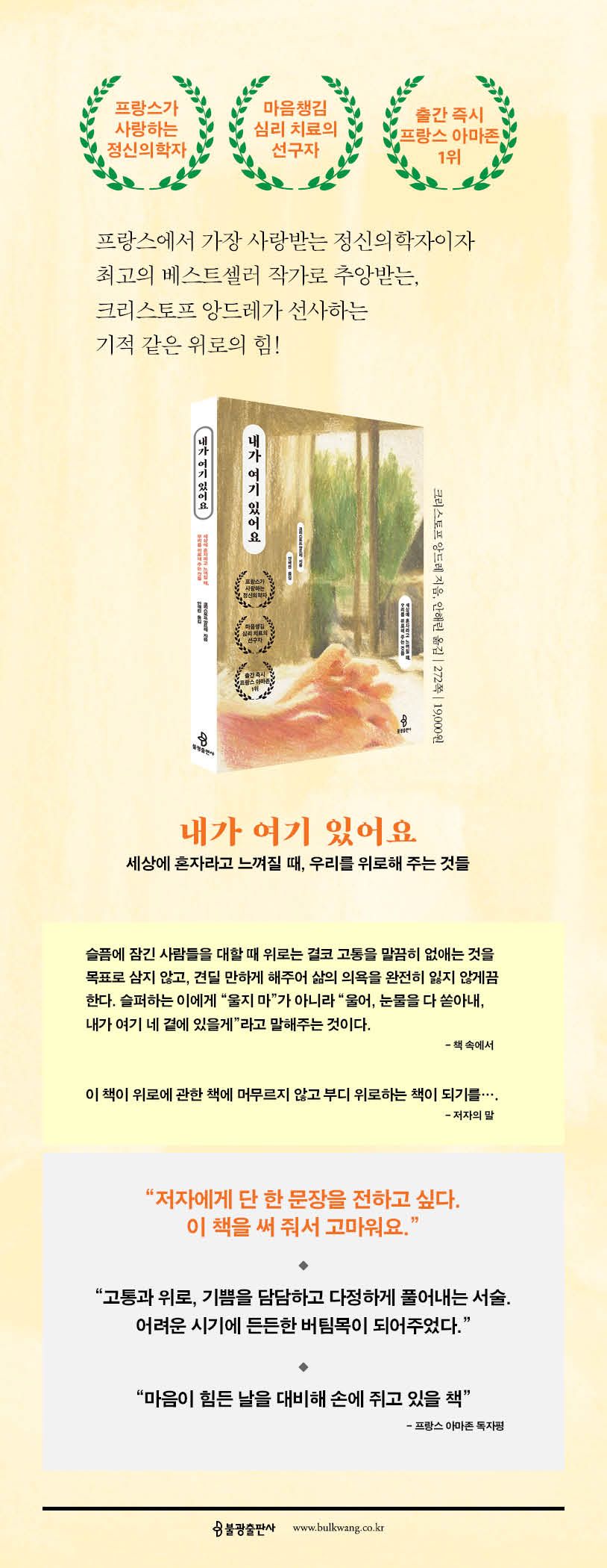 저자는 슬픔과 고통의 원인과 증세가 다양한 만큼, 위로의 근원 역시 무수히 많아질 수 있음을 알려준다. ‘이 책이 위로에 관한 책에 머무르지 않고 부디 위로하는 책이 되기를’ 기원하는 그의 말대로 「내가 여기 있어요」는 위로를 받고 싶은 사람에게도, 위로를 주고 싶은 사람에게도 도움을 주는 가이드이자 위로의 원천이 될 것이다.