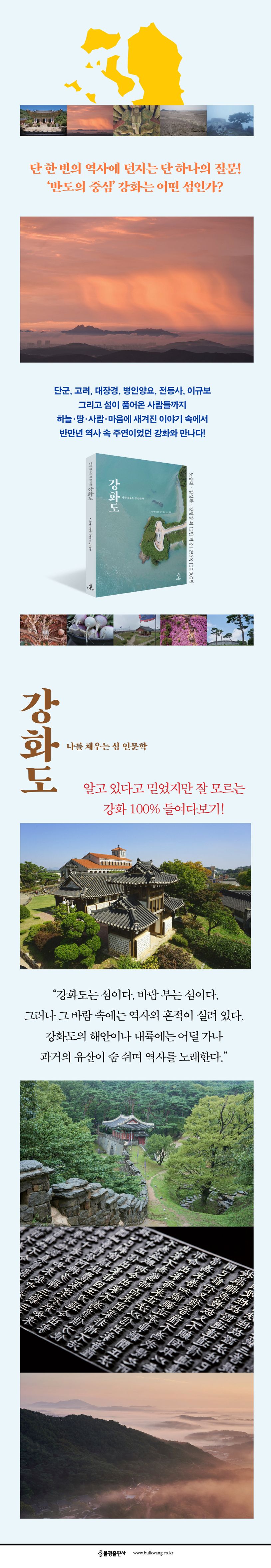 단한번의역사,단하나의질문‘반도의중심’강화는어떤섬인가?새로운만남을앞둔설렘으로가방을챙긴다.어디론가떠나기전에묻는다.왜떠나는가?수행자의구도행은너무무겁다.시간이남으니까,길이있으니까,당일치기가가능하니까떠난다는식은곤란하다.그래도떠남에는방향과목적,그리고정보들이필요하지않을까?강화는주말이면도로가몸살을앓는섬이다.왜그럴까?단한번의역사,단하나의질문을던진다.강화는어떤섬일까?우리나라에서4번째로큰섬,인천시강화군의주도(主島),경기도김포시와접한섬,마니산과참성단,강화순무와대몽항쟁….그리고?인터넷에정보가쌓일수록,검색에매달릴수록기억과생각하는노력은퇴색하기마련이다.안다고생각했던강화에물음표가꼬리에꼬리를문다.늘먹었던먹거리,보던풍경,찾았던핫스팟말고다른것은없을까?여행으로만접근하기엔너무아쉬운강화에는도대체어떤매력이숨어있을까?자세히보면사랑스럽다는데무엇을더알고자세히봐야할까?강화의역사를인문학으로새롭게접근한이책은여행을떠나기전설렘처럼알고있다고믿었지만잘모르는강화와의색다른만남을예고한다.단군,고려,대장경,병인양요,전등사,이규보그리고섬이품어온사람들까지하늘·땅·사람·마음에새겨진이야기속에서반만년역사속주연이었던강화와만나다!“강화도는섬이다.바람부는섬이다.그러나그바람속에는역사의흔적이실려있다.강화도의해안이나내륙에는어딜가나과거의유산이숨쉬며역사를노래한다.”(『나를채우는섬인문학강화도』26쪽)강화하면쉽게떠오르는키워드몇가지가있다.섬이라는지리적특성부터단군,고려,팔만대장경,병인양요와신미양요,가장오래된사찰전등사,문장가이규보,고인돌,강화순무등역사와인물그리고먹거리가생각난다.이게다일까?이책은단순한사료적지식나열에하나씩질문을던지고이야기를더해전혀다른새로운강화의면모를드러낸다.‘마니산참성단은단군을위한제를지내던곳’이라고알고있다면이런오해는접어두자.참성단은단군을제사하던평양의단군사당과황해도구월산의삼성사와성격이다르다.단군은마니산참성단에서하늘을향해제를올린제사장이었다.한국전쟁의흐름을바꾼1950년의인천상륙작전을결행한맥아더장군보다130여년먼저상륙작전을시도한장군이있다면믿을까?1866년강화를침략했던프랑스군을물리쳐병인양요를끝낸인물이바로양헌수장군이다.그는정족산성에서반격의서막을계획하고포수로구성된조선군500명과함께강화해협건너정족산성서벌인전투로프랑스군을돌려보냈다.그런가하면,강화는뛰어난인재들의고향이자한나라의행정을책임진수도이기도했다.조선시대최연소로과거시험에합격한이건창은고승들의찬을썼고,『능엄경』을달달외웠던천재문장가이규보는서쪽을바라보며강화에서눈을감았다.게다가한양과서울보다먼저우리나라의수도였던곳도강화다.고려의수도일때고려인들은강화에서팔만대장경을기획하고만들었다.뿐만아니다.강화주민은집에서많은신을포용하며신과함께살고있고,기독교는강화에서첫발을내디뎠다.인천에상륙한성공회의첫조선인신자는강화주민이었고,가장오래된성공회한옥성당이강화에있다.이모든서사가이책한권에집약됐다.여행서처럼가벼운정보에머무르지않고역사서처럼고리타분하지않다.한권의매거진처럼산뜻한디자인속에단행본의알찬지식이담겼다.두번,세번다시볼수록진한여운을주는영화처럼강화의새로운맛을보여주는책이다.책의마지막페이지를덮는순간,강화행버스에올라탄자신을상상해보는것도설레는일이다.