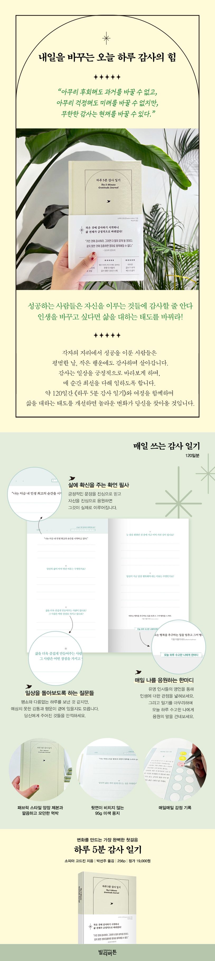 아울러 각 페이지마다 긍정 확언과 감사의 힘을 느낀 유명 인사들의 한마디가 담겨 있다. 이 문장들은 여러분에게 충분한 동기부여를 제공하고, 감사를 더 자주, 습관처럼 실천할 수 있도록 북돋울 것이다.