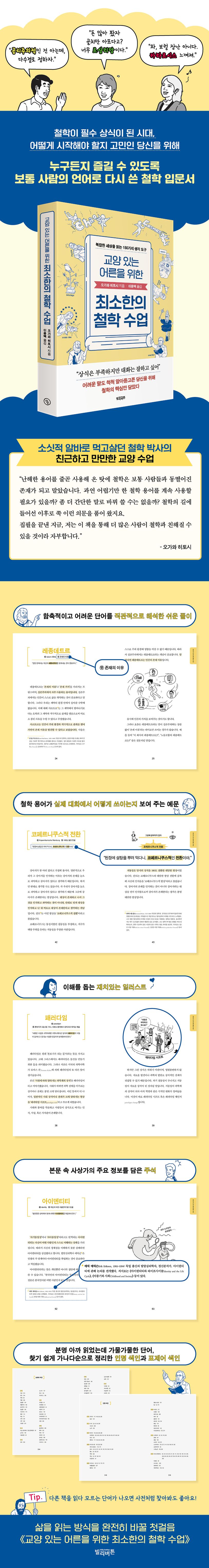 그리고 그 흐름에 합류하고자 하는 당신이 있다. 철학에 관심은 있지만, 어디서부터 시작해야 할지 갈피가 잡히지 않을 것이다. 유명한 철학책을 펼쳤다가 외계어 같은 용어에 소스라치게 놀라 잠시 철학을 멀리했을지도 모른다.《교양 있는 어른들을 위한 최소한의 철학 수업》은 그런 당신의 고민을 해결해 줄 친절한 철학 입문서다.