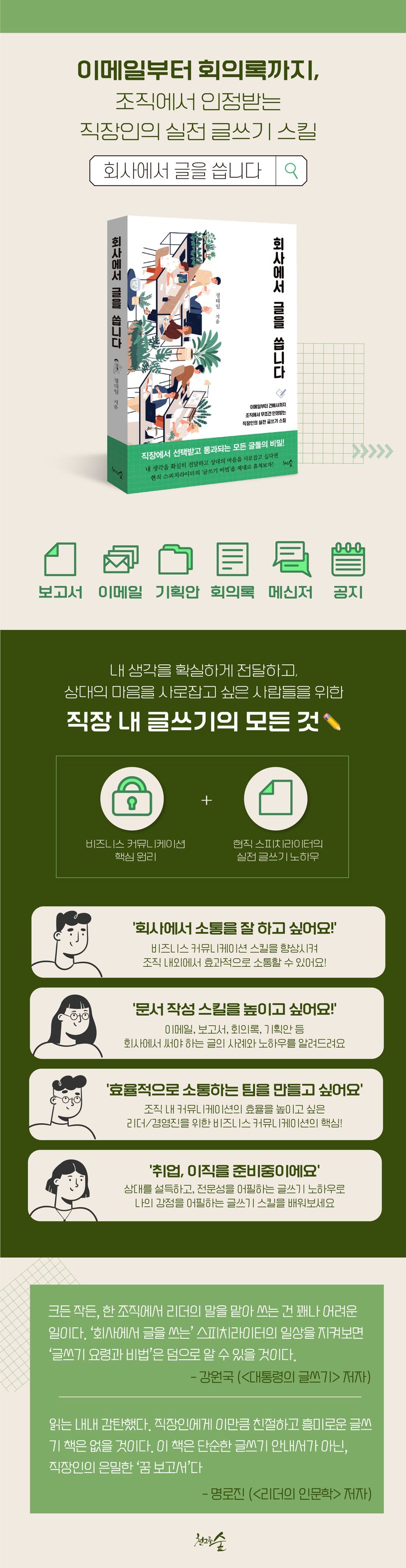 글쓰기가 두렵다는 직장인들이 꽤 많습니다. 그럴 법도 한 게, 우리는 좋은 선생님을 만나 글쓰기를 체계적으로 배워본 적이 한 번도 없습니다. 글쓰기라곤 시험문제를 풀기 위해 학교에서 배워본 게 전부입니다. 세상이 이러하니 글쓰기를 싫어하고 두려워하는 게 꼭 우리들만의 잘못은 아닙니다. 이 책 《회사에서 글을 씁니다》는 대기업에서 사장님의 글을 쓰고 있는 현직 스피치라이터(비즈니스 라이팅 전문가)가 직장인들이 어떻게 하면 회사에서 원하는 글을 쓸 수 있을까 함께 고민하고 한 발씩 함께 걷는 친절한 책입니다. 특히 회사에서 가장 많이 접하는 이메일과 보고서부터 일상에서 많이 쓰는 리뷰와 SNS까지 상대의 마음을 사로잡는 글쓰기 방법을 친절하게 알려줍니다.