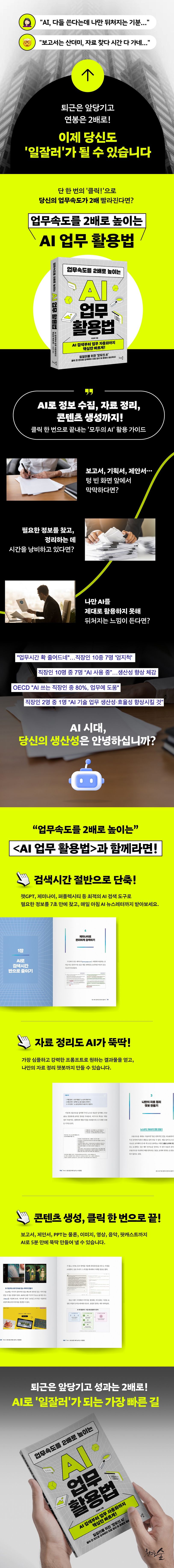 지금 바로 AI를 활용하여 검색 시간을 줄이고, 필요한 이미지를 생성하며, 자신만의 업무용 앱을 만드는 등 압도적인 효율을 경험해 보자. 이 책은 당신의 업무속도를 2배로 높이고, 더 나아가 삶의 질까지 향상시킬 실질적인 지침서가 될 것이다.