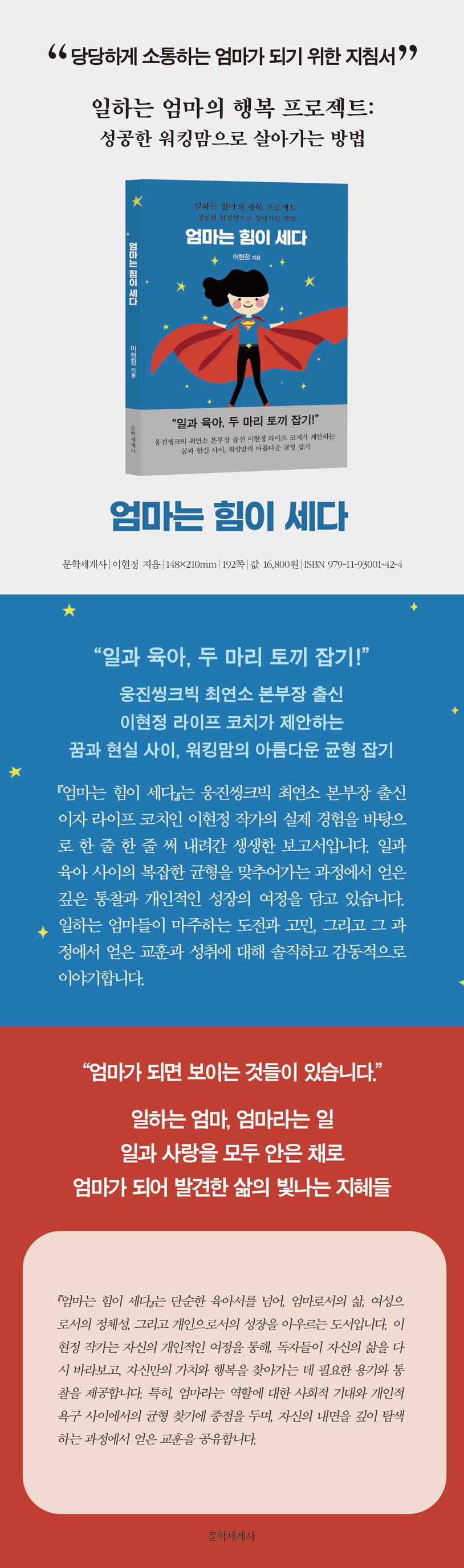 『엄마는 힘이 세다』는 웅진씽크빅 최연소 본부장 출신이자 라이프 코치인 이현정 작가의 실제 경험을 바탕으로 한 줄 한 줄 써 내려간 생생한 보고서입니다. 일과 육아 사이의 복잡한 균형을 맞추어가는 과정에서 얻은 깊은 통찰과 개인적인 성장의 여정을 담고 있습니다. 일하는 엄마들이 마주하는 도전과 고민, 그리고 그 과정에서 얻은 교훈과 성취에 대해 솔직하고 감동적으로 이야기합니다. 엄마가 되면서 겪는 정체성의 혼란, 일과 가정 사이의 균형, 자기 자신을 돌보는 중요성, 그리고 자신만의 꿈을 추구하는 과정에서의 어려움과 기쁨을 생생하게 그립니다. 또한, 육아와 직장 생활 사이의 균형을 찾기 위한 노력, 자기 자신에게 필요한 시간과 공간을 만드는 법, 그리고 자신의 열정을 따르는 중요성에 대해 깊이 있게 탐구합니다.