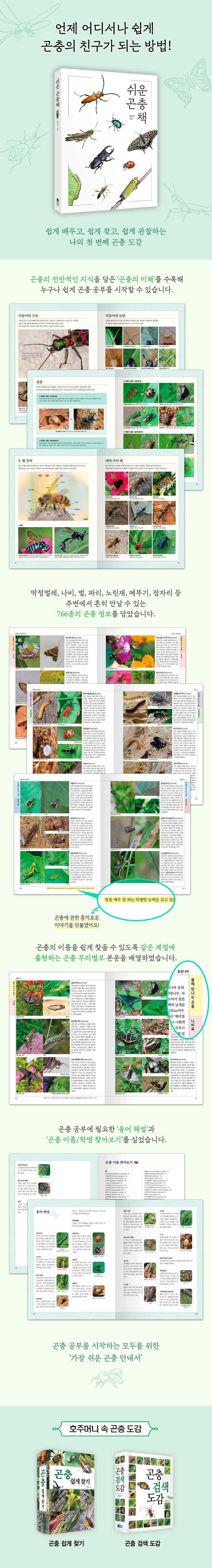 『쉬운 곤충책』은 곤충을 알고 싶고 공부하고 싶은 모두를 위한 가장 쉬운 곤충 안내서이다. 누구나 쉽게 찾고 관찰할 수 있도록 주변에서 흔히 만나는 766종 곤충 정보를 2,000여 컷의 사진과 함께 알기 쉽게 담았다. 곤충이 출현하는 시기에 따라 봄, 여름, 가을, 겨울의 계절별로 구분하고 같은 계절에 출현하는 곤충을 딱정벌레목, 나비목, 벌목, 파리목, 노린재목, 메뚜기목, 잠자리목, 다양한 곤충의 순서로 실었다. 곤충의 구조와 생태, 무리별 특징 등 곤충에 대한 전반적인 지식을 담은 [곤충의 이해] 장을 통해 곤충을 올바르게 이해하도록 도왔으며, ‘용어 해설’을 수록하여 곤충 공부를 처음 시작하는 이들은 물론 보다 깊은 지식을 원하는 곤충 애호가에게도 유용하다.