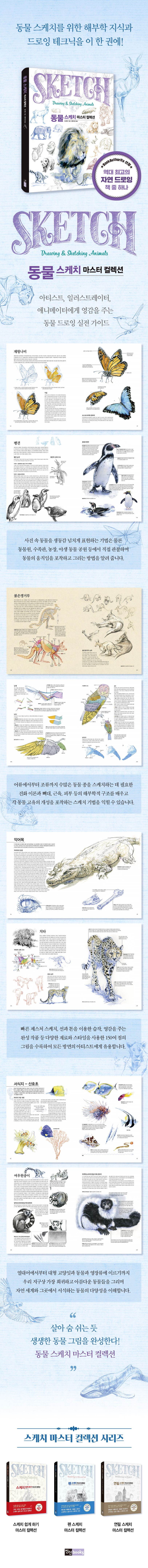 『동물 스케치 마스터 컬렉션』은 생동감 넘치는 동물 스케치를 위한 다양한 생물학적 지식과 드로잉 테크닉을 담은 동물 스케치 종합 안내서이다. 사진 속 동물을 살아 숨 쉬는 듯 생생하게 표현하는 기법은 물론 동물원, 수족관, 농장, 야생 동물 공원 등에서 직접 관찰하며 동물의 움직임을 포착하고 그리는 방법을 알려 준다. 어류에서부터 조류까지 수많은 동물 종을 스케치하는 데 필요한 진화 이론과 뼈대, 근육, 피부 등의 해부학적 구조를 배우고 각 동물 고유의 개성을 포착하는 스케치 기법을 익힐 수 있다. 빠른 제스처 스케치, 선과 톤을 이용한 습작, 영감을 주는 완성 작품 등 다양한 재료와 스타일을 사용한 150여 점의 그림을 수록하여 모든 방면의 아티스트에게 유용하다. 열대어에서부터 대형 고양잇과 동물과 영장류에 이르기까지 우리 지구상 가장 희귀하고 아름다운 동물들을 그리며 자연 세계와 그곳에서 서식하는 동물의 다양성을 이해하는 좋은 기회가 될 것이다.