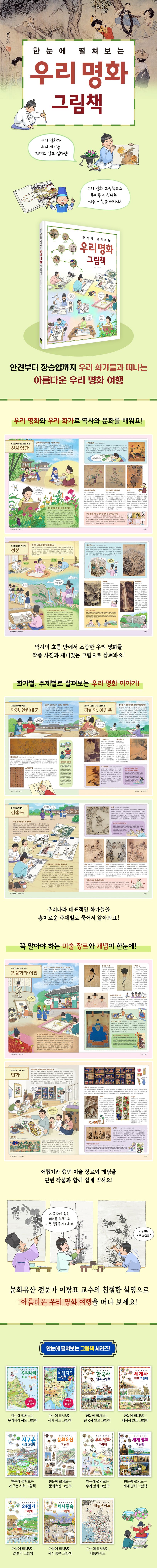 《한눈에 펼쳐보는 우리 명화 그림책》은 안견, 신사임당, 정선, 김홍도, 신윤복 등 우리나라 대표적인 화가들의 명화를 역사 흐름에 따라 소개했습니다. 여러 화가를 흥미로운 주제별로 묶어서 설명하고, 꼭 알아야 할 미술 장르는 ‘초상화와 어진’, ‘기록화’, ‘민화’처럼 따로 구성하여 살펴보았습니다.