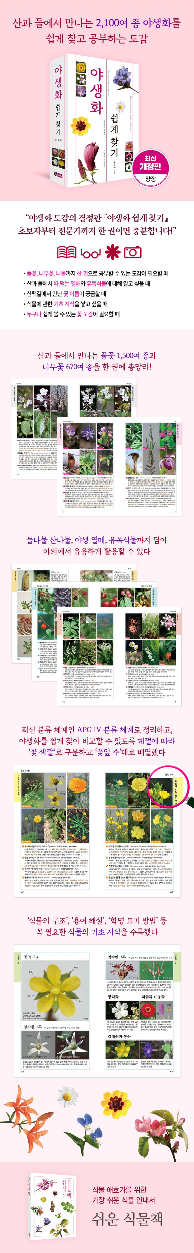 『야생화 쉽게 찾기』는 산과 들에서 만나는 풀꽃 1,500여 종과 나무꽃 670여 종을 합해 총 2,100여 종의 야생화를 한 권에 총망라했다. 최신 분류 체계인 APG IV 분류 체계로 정리하고, 야생화를 쉽게 찾아 비교할 수 있도록 계절에 따라 ‘꽃 색깔’로 구분하고 ‘꽃잎 수’대로 배열하였다. 〈들나물 산나물〉, 〈산과 들에서 따 먹는 열매〉, 〈유독식물〉도 함께 실어 일상과 야외에서 유용하게 활용할 수 있다. 초보자도 야생화를 쉽게 공부할 수 있도록 한글 용어를 주로 사용하고, 부록으로 ‘식물의 구조’, ‘용어 해설’, ‘학명 표기 방법’ 등 꼭 필요한 식물의 기초 지식을 수록하였다.