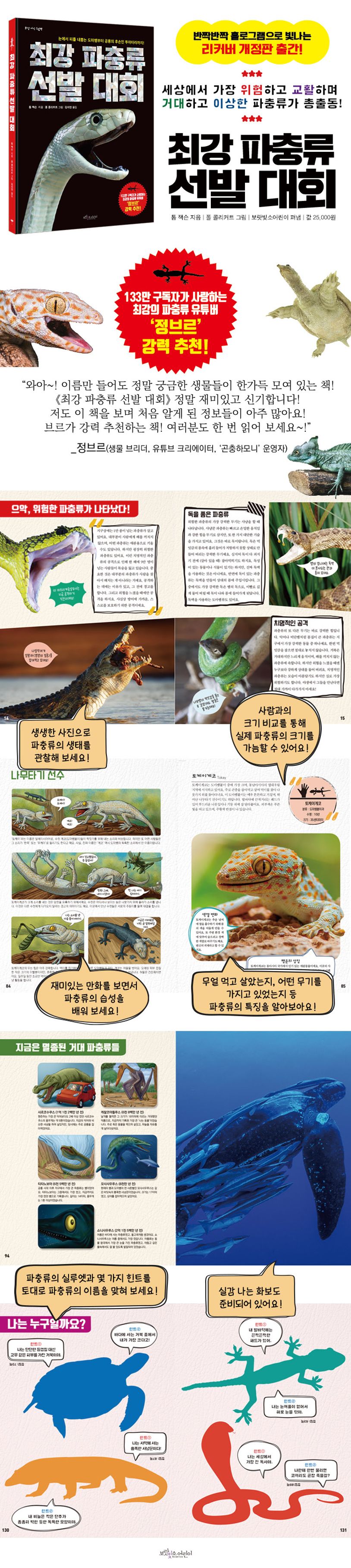 50만구독자를자랑하는대한민국최고의파충류전문유튜버‘정브르’님도이책을통해새로운정보를많이얻었다고강력히추천해주셨어요.흥미진진하고재미있는‘최강파충류선발대회’,지금부터시작해볼까요?