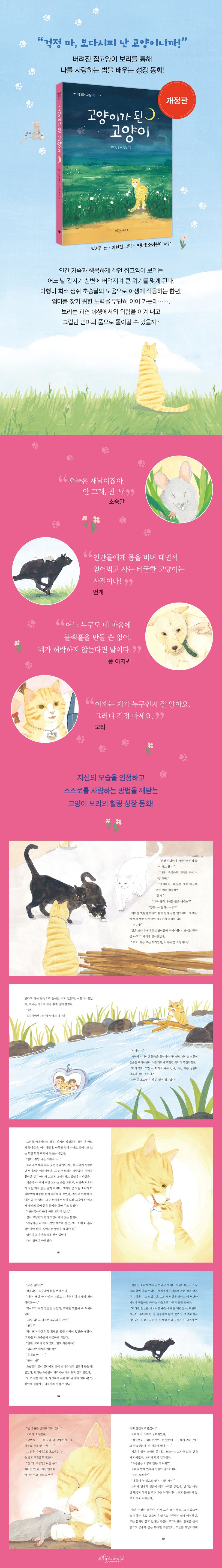 지난 2019년에 출간된 이후, ‘행복한 아침독서 추천도서’로 선정되는 등 각종 기관 및 독자들의 많은 사랑을 받아온 《고양이가 된 고양이》가 새로운 표지를 입고 개정판으로 출간되었습니다. 이 책은 집고양이 보리의 성장통을 통해 어린이들에게 건강한 자존감이 얼마나 중요한지 깨닫게 해주는 성장 동화입니다. 더불어 우정의 소중함과 반려동물 문제의 실태까지 일깨워 줍니다.