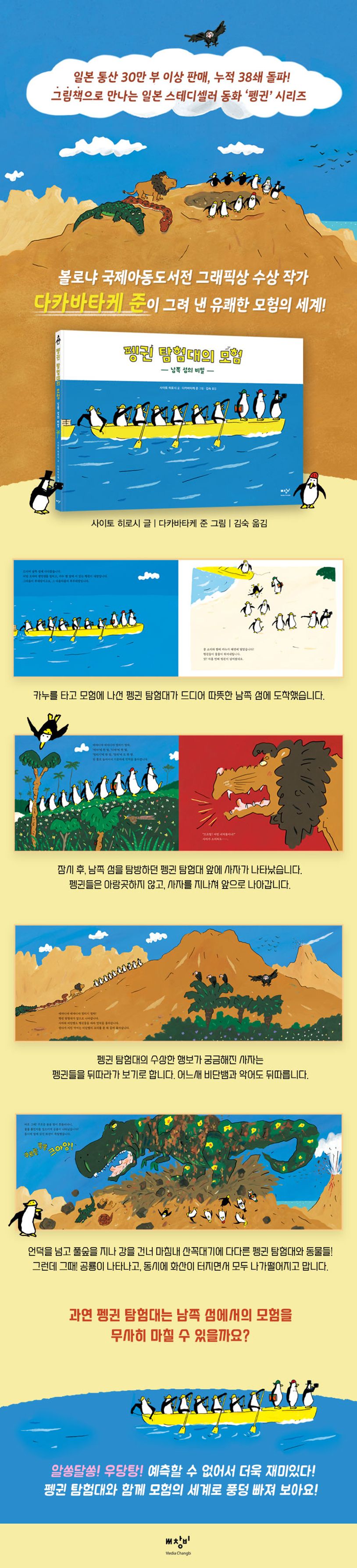 20년 넘게 일본 독자들에게 꾸준한 사랑을 받아 온 저학년 동화 ‘펭귄’ 시리즈가 그림책으로 재탄생했다. 미디어창비에서 출간된 『펭귄 탐험대의 모험: 남쪽 섬의 비밀』은 남쪽 섬에서 펼쳐지는 펭귄 탐험대의 좌충우돌 모험 이야기로, 동화에서 호흡을 맞춘 두 원작자 사이토 히로시와 다카바타케 준이 다시 합심해 스토리와 등장인물을 그림책에 맞게 각색한 작품이다. 호기심을 유발하는 점층적 서사 구조, 말맛을 살린 리듬감 있는 글, 다채로운 원색을 포인트로 활용한 그림이 조화를 이뤄 원작이 가진 매력을 배가시키면서, 일본에 이어 한국 독자들의 마음까지 사로잡을 것이다.