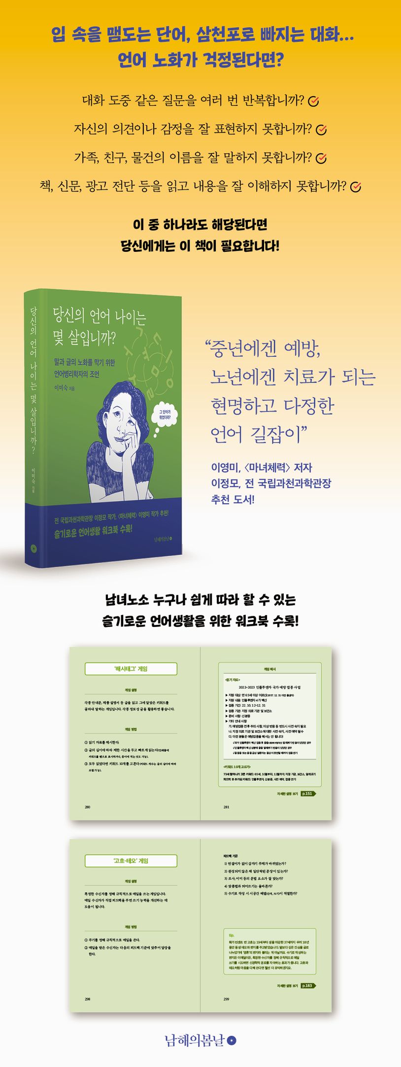 어린아이가 말을 배우듯, 나이 들어서도 다시 언어 연습이 필요하다. 언어병리학자인 저자는 노화와 언어의 상관관계를 뇌과학 측면에서 설명하고, 노년기 언어의 특징과 질환을 증상별로 소개한다. 또 이러한 질환을 예방하고 언어 능력을 강화할 수 있는 다양한 언어 게임과 일상 꿀팁을 소개한다. 책에 등장하는 다양한 언어 게임을 따라하며 신경을 자극하고 꾸준한 학습으면 보다 건강하고 행복한 언어생활을 누릴 수 있다. 책 속에 등장하는 18개의 언어 게임과 도전 미션은 책 말미에 워크북으로 수록해 더욱 실용성을 높였다.