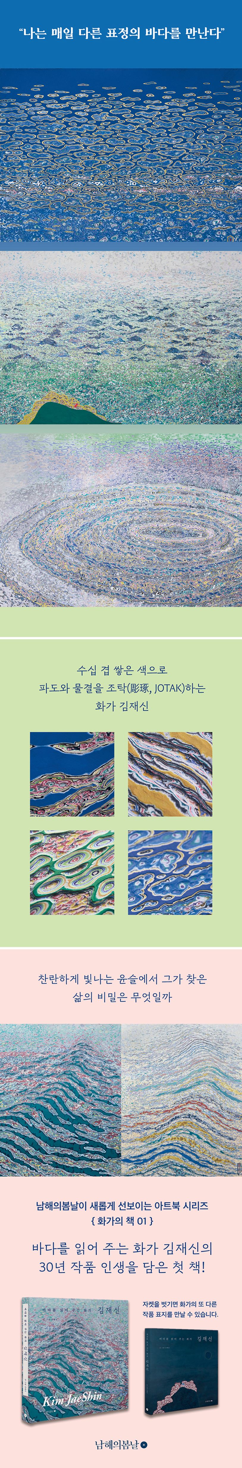 오랫동안 묵묵히 한 길을 걸어온 화가의 농도 짙은 삶에서 길어낸 다채로운 작품 이야기를 직접 그들의 목소리로 전하는 새로운 시리즈 〈화가의 책〉. 그 첫 번째 주인공 김재신 화백이 직접 이야기하는 작품과 철학, 삶을 담았다. 나고 자란 고향 바닷가에서 매일매일 달라지는 바다의 다양한 표정을 눈에 담고 마음에 품어 화폭에 새겨온 김재신 화가. 20여 년 전, 국내에서 처음으로 조탁 기법이라는 독창적인 작업 방식으로 그림을 그리기 시작하여 많은 주목을 받은 김재신 화가는 국내를 넘어 해외에서도 뛰어난 화풍으로 주목받기 시작한 중견화가다. 김재신 화가는 수십 년의 시간을 한결같이 매일매일 나고 자란 통영의 바다를 지나 작업실로 출퇴근하며 하루 10시간 이상 작업에만 몰두해 왔다. 창작의 고된 시간들을 지나 찬란한 열매를 맺는 과정이 작품 하나하나에 오롯이 새겨져 있어 작품을 보는 이들의 깊은 감동과 탄성을 자아낸다. 매 순간 수천의 빛깔로 찬란한 바다, 한없이 깊고 역동적인 바다 풍경에서 영감을 받은 역작 〈파도〉 시리즈가 어떻게 탄생했는지, 또 바다와 조화를 이루고 살아가는 인간의 삶이 담긴 〈바다〉, 〈섬〉, 〈동피랑이야기〉, 〈통영풍경〉 등 지난 30년의 작품 중 55여 점을 엄선하여 글과 함께 담았다.