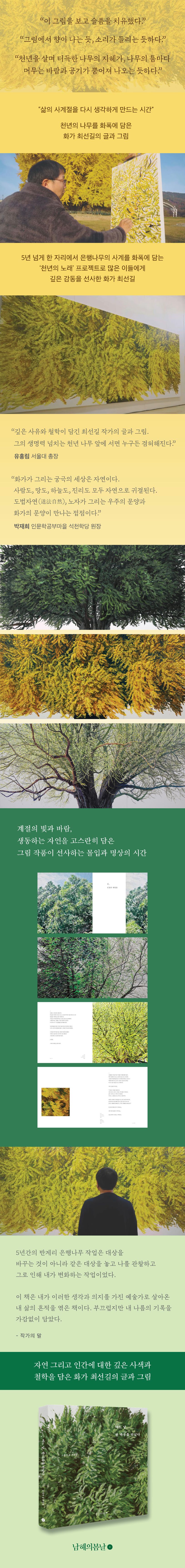 은행나무에 사로잡힌 화가가 있다. 오랫동안 한국의 산과 나무를 화폭에 담아온 화가 최선길. 서울대 회화과를 졸업한 그는 40년 가까운 세월 동안 자연의 풍경 속에서 인간의 삶을 성찰해 왔다. 그러던 중에 한 나무를 만났다. 1318년을 산 원주 반계리 은행나무다.