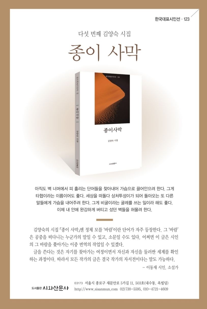 1부종이사막몽고반점/15깡깡이마을/17낙타와말걸기/19담쟁이의보법/22중동역의피핑톰/23종이사막/25절영도/28뿌리로가는문-경순왕릉/30배롱나무의일기장/32감씨의배후/342부왜아픈동백이야동백에묻다-4.3/39상징에대한예의-4.3/41왜아픈동백이야?/44현무암의기억-4.3/46화면밖에서오래된슬픔을씹었다/48재두루미/50그러니까민주/52노을은또다른시작으로가는골목-매향리/53그골목의책장풍경-이태원/5611월의폭설/583부활자의정원게틀레기의고해성사/61깨어진봄의행로/64신흥청망청/67칼로의골목/69활자의정원/72물이꽃이되다/74세겹,또는여자/75일식,또는그물망/77전설과토산뱀*/79접혀진아래아/804부서양등골나물달개비꽃-제암리/85명자꽃/87아름다운증표-꽃무릇/89서양등골나물/92순비기나무/94가을,화살나무/95선운사동백/97청령포소나무/99퐁낭의사생활/100가을나무의전언/1025부그리운농담익명의일기-s에게/107불온한동거·3-이명/109북부역혹은각주/110발칙한뿌리/112무빙워크/113괄호안의백과사전-김야천화가/116건전지의불면/118충분하다/119물먹이다-골드미스/121그리운농담/122자코메티의행렬-골령골/124■해설|바람이전하는말-이동재(시인,소설가)/129