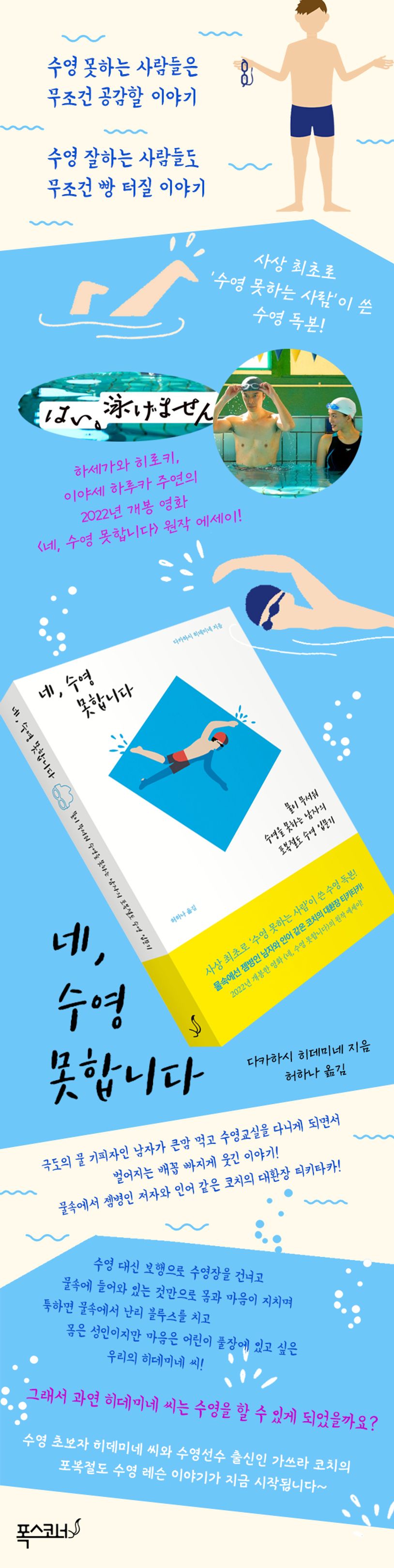 《네, 수영 못합니다》는 수영을 못하는 사람이 읽는다면 무조건 공감하며 웃음을 터트릴 수밖에 없고 수영을 잘하는 사람이 보아도 수영 왕초보가 한없이 진지하게 고찰해 터득한 수영의 이론에 찬사를 보내게 될 이야기이다.