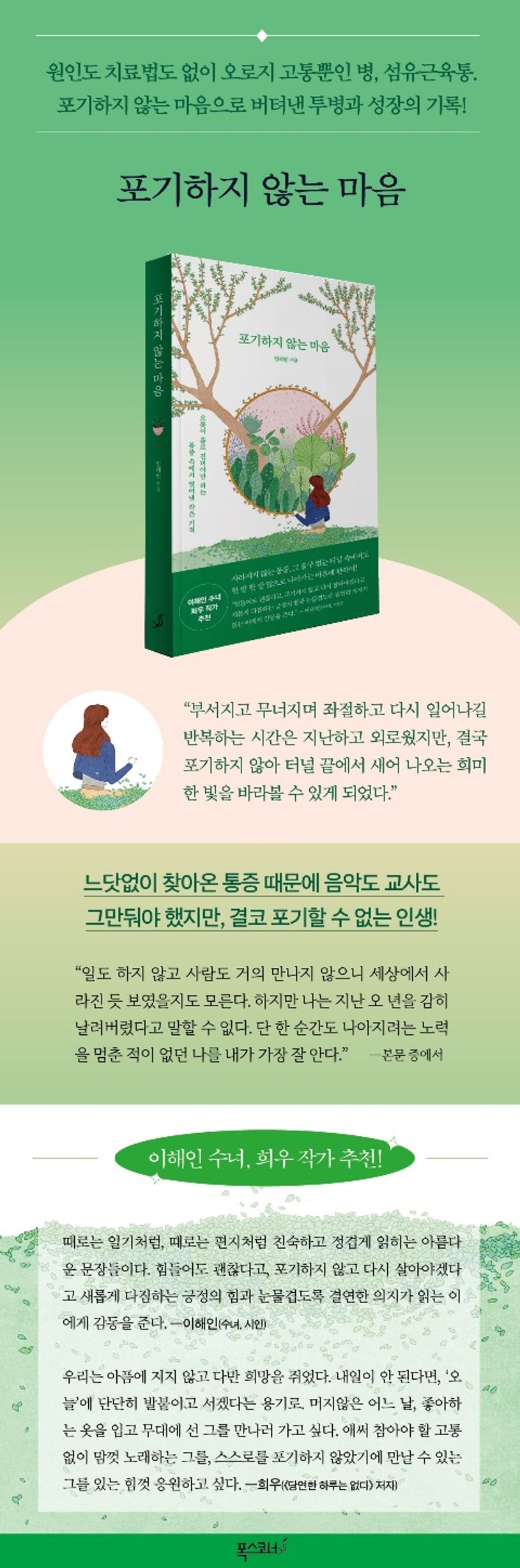 《포기하지 않는 마음》은 포기하지 않는 마음으로 버텨낸 투병의 과정과, 그 힘든 가운데서도 조금씩이지만 앞으로 나아갔기에 기어이 또 성장한 기록을 담아낸 에세이이다. 사실 극심한 통증과 사회생활에서 한발 물러날 수밖에 없었던 고립 속에서 그녀가 선택한 일들 가운데 하나가 글쓰기였다. 통증의 시간을, 그 기약 없는 고통의 시간을 해독하기 위해 쓴 글이 하나의 책으로 엮여 나왔다.