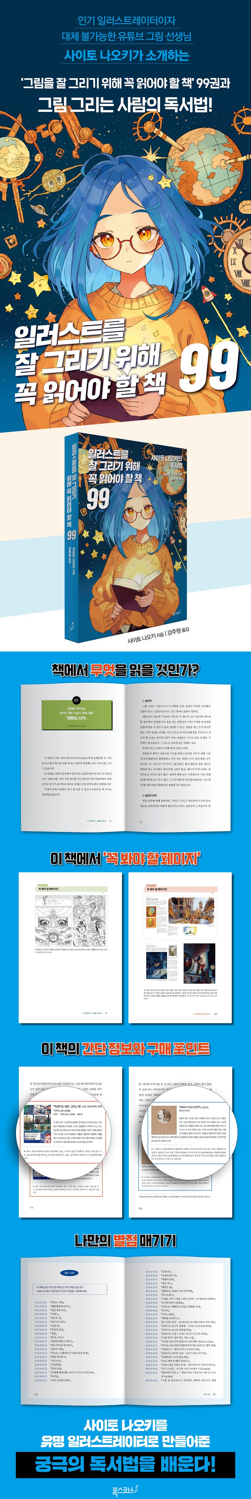 그저 그림이 느는 즐거움을 느끼고 싶은 사람부터 전문 일러스트레이터로서의 개성을 확보하고 싶은 사람까지, ‘일러스트를 더 잘 그리고 싶은 사람이라면’ 누구에게나 도움이 되는 사이토 나오키의 독서법과 99권의 추천 도서를 만나보기를 권한다. 사이토 나오키 자신이 그랬던 것처럼 소개된 책들을 통해 그림 실력이 크게 늘어가는 경험을 만끽할 수 있을 것이다.