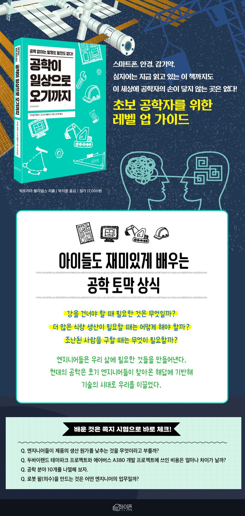 ‘공학’이라는 단어를 들으면 가장 먼저 떠오르는 것은 아마 기계와 그런 기계를 개발하고 연구하는 엔지니어일 것이다. 하지만 기계 공학은 무궁무진한 공학의 한 분야에 불과하다. 이 책은 화학 공학, 기계 공학, 생명 공학 등 다양한 공학의 분야를 소개하며, 건축, 우주 개발, 의료 기술 등 공학을 응용한 분야의 대표적인 기술과 그 기술의 원리, 발명의 뒷이야기 등으로 구성되어 있다. 그뿐만 아니라 사소하고 재미있는 토막 상식과 해당 주제를 가볍게 복습해 볼 수 있는 쪽지 시험을 통해 공학에 대한 지식을 보다 유쾌하게 학습할 수 있도록 돕는다.