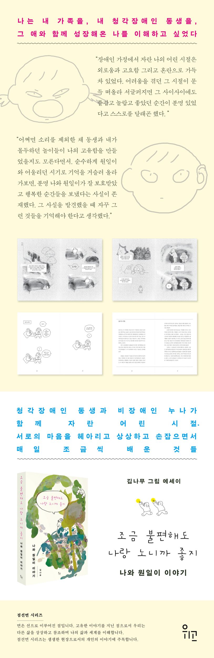 김나무작가의동생원일이는네살에청력을잃었다.열감기를누나와동생이나란히앓고난뒤,동생만청력을잃게되었다.그후원일이에게는장애인이라는새로운단어가따라붙었고,자신에게는장애인동생을챙겨야한다는책임감과함께‘원일이누나’라는호칭이더익숙해졌다.집안분위기도자연스레원일이위주로흘렀다.