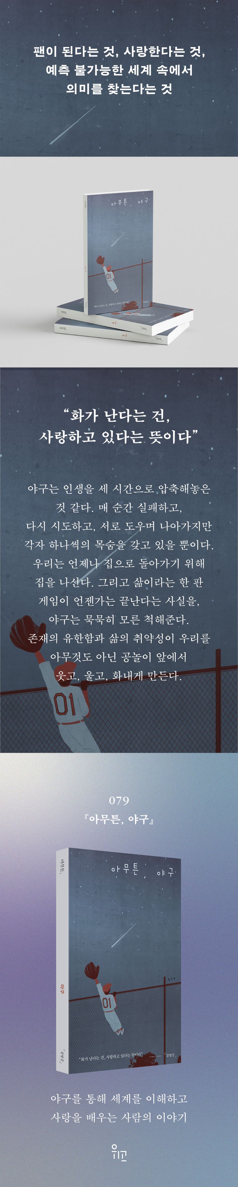 아무튼 시리즈 79번은 예술가이자 독립출판인 김영글의 『아무튼, 야구』이다. 저자 김영글은 피구 공을 두려워하는 어린이, 구기 종목을 달가워하지 않는 청소년을 거쳐 당구공 몇 번 쳐본 것이 전부인 성인이 되었다. 공과는 거리가 먼 삶을 살았던 그에게, 어느 날 야구공이 나타났다. 암 수술을 겪고 남한강을 따라 떠난 어느 겨울밤, TV 속 야구 예능의 한 장면에서 ‘공 하나의 우주’에 매혹된 것이다. 『아무튼, 야구』는 글과 예술 안에 살던 여성이 야구를 만나고 이전까지와는 사뭇 다른 렌즈로 삶을 바라보고 알아가는 이야기다.