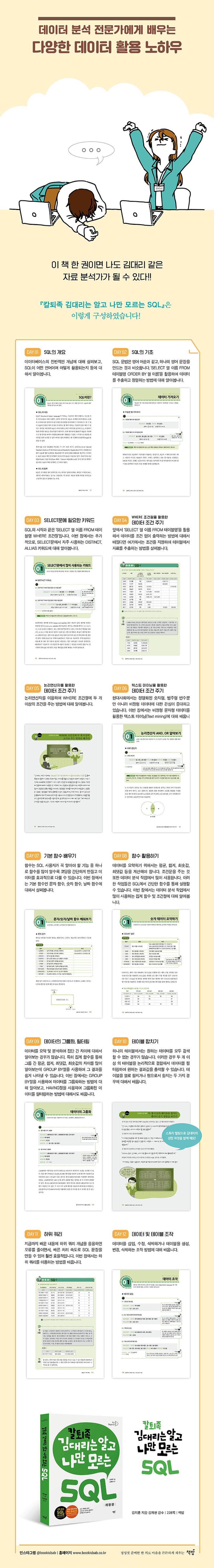 『칼퇴족 김 대리는 알고 나만 모르는 SQL』은 SQL 입문자의 눈높이에 맞춘 기초 필독서이다. 실무에서 바로 쓸 수 있는 내용만 엄선하여 ‘가장 쉽게’, ‘최소한의 분량’으로 설명한다. 물론 SQL을 마스터하려면 훨씬 많은 내용의 개념들을 알아야 하겠지만, 이 책은 SQL을 처음 배우는 사람이 실무에 투입되었을 때 바로 성과를 뽑아낼 수 있게 하는 데 초점을 맞춰진 책이다. 2주 안에 SQL로 실무를 처리할 수 있도록 구성되어 있으며, 그날 배울 내용을 스토리텔링으로 재미있게 살펴보고, 본문 중간중간에도 마치 멘토가 옆에서 친절하게 설명해주는 듯한 팁 요소나 실무 개념이 적용된 예제풀이 과정이 준비되어 있다.