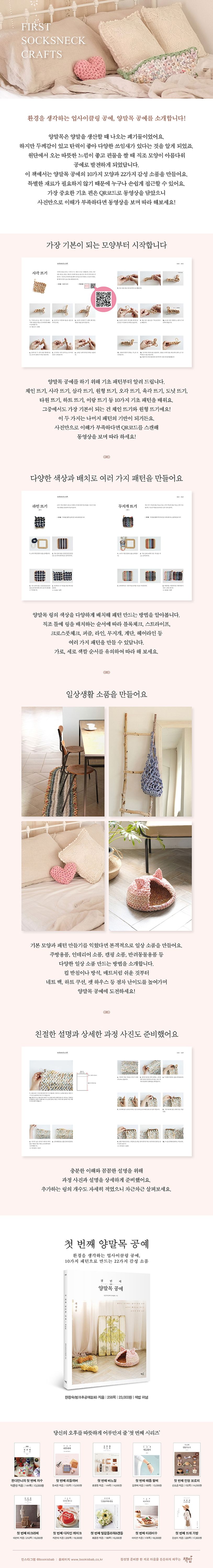 『첫 번째 양말목 공예』는 양말목 공예를 처음 접하는 사람을 위한 수공예 책으로, 기본 모양과 패턴을 만들 수 있는 베이직 두 파트와 활용 네 파트로 구성했다. 먼저 ‘Basic 1’에서는 링을 엮는 기본적인 방법 10가지를 다루고 ‘Basic 2’에서는 링을 직조해서 패턴을 만드는 방법을 다룬다. 계속해서 활용 파트에서는 주방용품, 인테리어 소품, 캠핑용품, 반려동물용품을 만들어 본다.